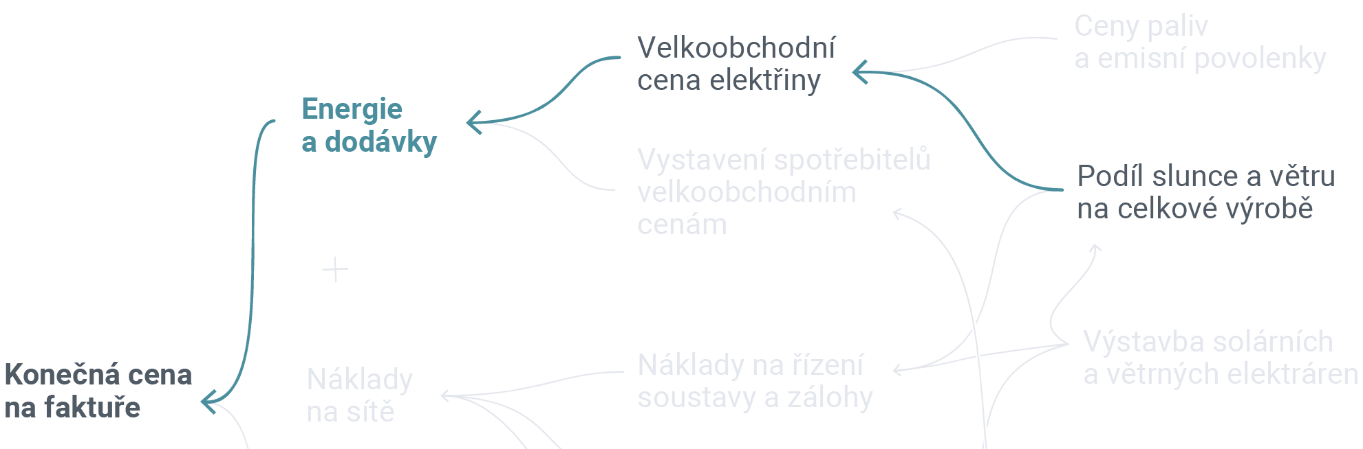 - Energie a dodávky (angl. energy & supply). Tuto složku tvoří náklady dodavatele, zejména náklady na nákup elektřiny na velkoobchodním trhu, administrativní náklady dodavatelské společnosti, služby pro zákazníky atd.