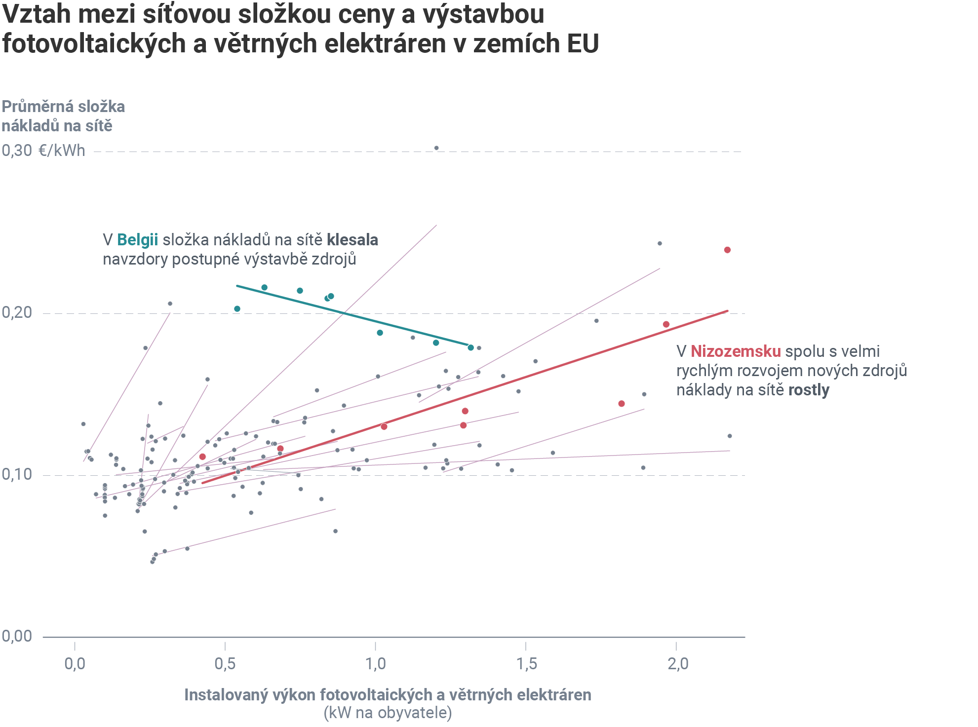 Vzhledem k tomu, že momentální výroba z fotovoltaických (a v menší míře i větrných) elektráren je často velmi podobná na velkém území najednou (viz např. Riepien, Brown, Zavala, 2025), může docházet k plnému vytížení přeshraničních přenosových linek a nutnosti využít náhradní zdroje elektřiny. Tím vznikají náklady na maření elektřiny, congestion management a redispečink. Do jisté míry se jedná o náklady způsobené pomalým rozvojem sítí v minulosti. ↩︎